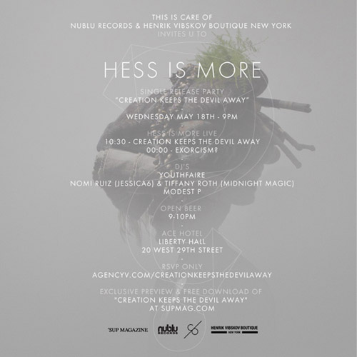 Nublu Records has been gearing up for the release of Creation Keeps The Devil Away, the new single by Hess is More, headed by multi-instrumentalist, singer and provocateur Mikkel Hess. Coming fresh from a series of shows around New York, Hess is More is ready to take us on a new musical journey this summer with a series of single releases and a new album expected in September of 2011. SUP Magazine is giving away the free download before its official release for a limited time! Hope to see you at the party. free download here.