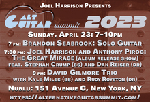 7pm-10pm Joel Harrison Presents: Alt Guitar Summit 2023 -Brandon Seabrook (Solo Guitar) -Joel Harrison and Anthony Pirog: The Great Mirage (Album Release Show) feat. Stephan Crump and Dan Reiser -David Gilmore Trio with Kyle Miles and Rudy Royston