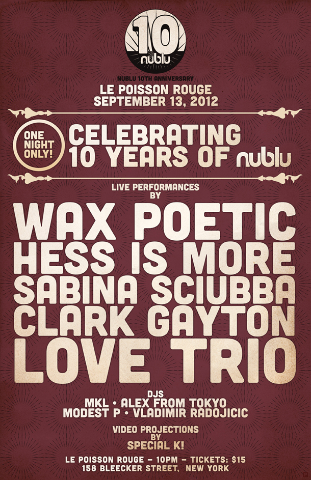 Nublu turned 10 this June and we had a series of great shows at our club during the whole month. We are took the party to Le Poisson Rouge to continue the celebration. Live performances by Wax Poetic, Hess is More, Sabina Sciubba (Brazilian Girls) solo project, Clark Gayton and Love Trio.